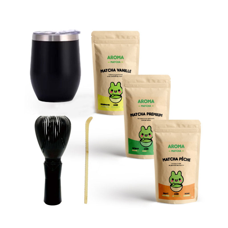 Discover our Matcha Essentials Pack , including everything you need to prepare and enjoy your favorite matcha. This pack includes a traditional whisk (chasen) , a spoon (chashaku) for precise dosing, an insulated cup to take your drink everywhere, as well as 3 matcha bags (30g each) among the flavors plain, vanilla, chocolate, strawberry, peach or mint. Perfect for tea and infusion lovers or those who want to discover a complete matcha experience, combining quality , flavor and practicality .